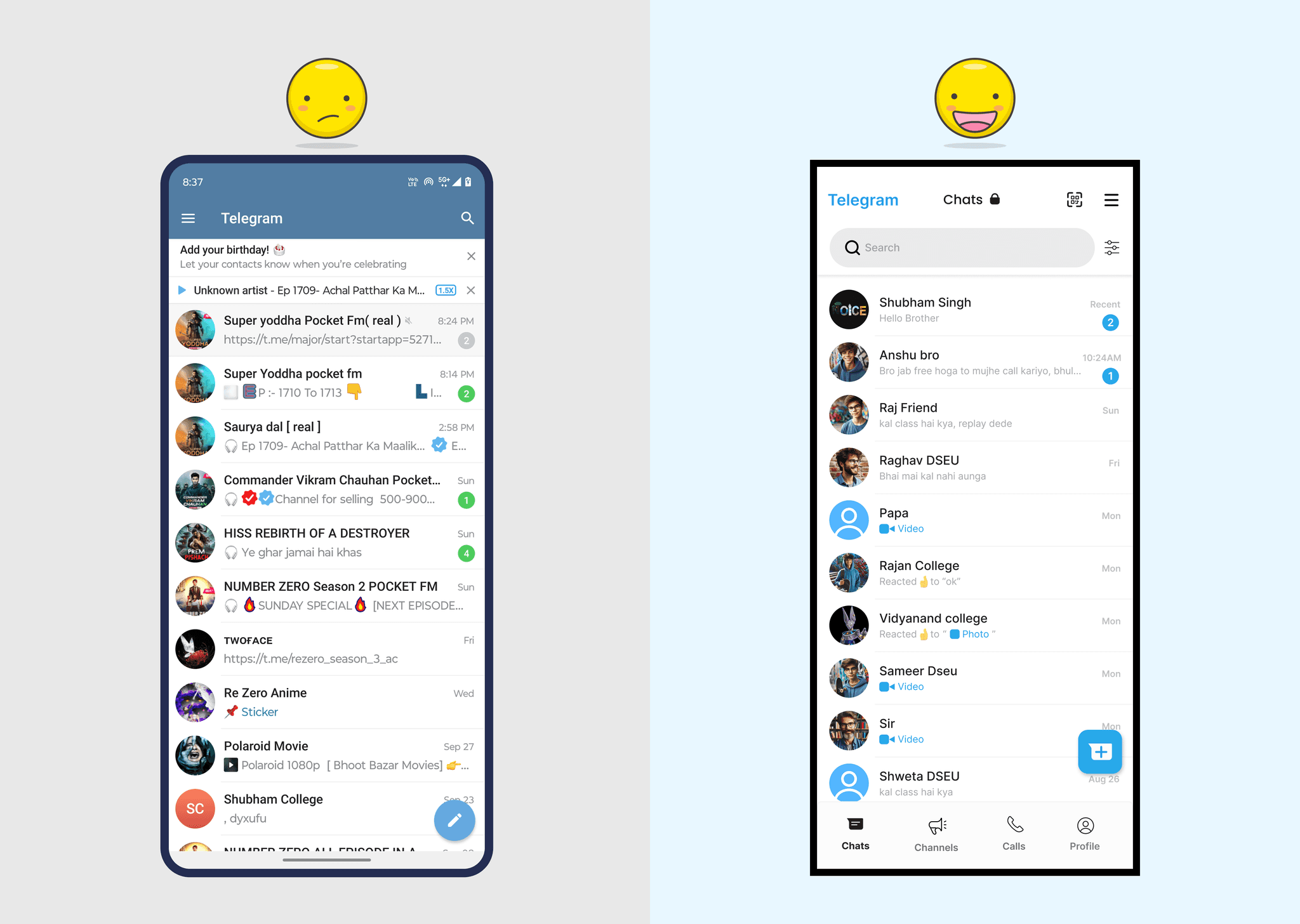 I redesigned the Telegram app to enhance user experience and make communication feel more seamless and personal. My focus was on improving interface clarity, simplifying navigation, and refining visual hierarchy for better accessibility. The new design offers a cleaner look, smoother interactions, and a more intuitive chat experience while maintaining Telegram’s identity of speed, privacy, and reliability.